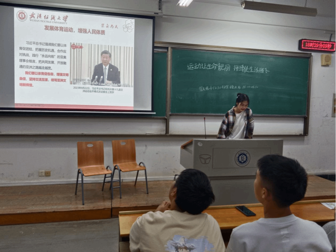 随后,同学们在团支书带领下学习了习近平总书记在杭州亚运会开幕式上关于“发展体育运动,增强人民体育”的重要谈话,欣赏了运动员在杭州亚动会英勇拼搏,良性竞争的体育精神,号召同学们主动参加体育活动,提高身体素质,各方面全面发展,成长为新时代复合型人才。