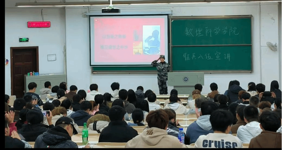 随后,国防宣讲团的同学向同学们介绍了什么是国防,并从“红海行动”,“战狼”等电影的片段中说明国防的重要性;向同学们讲述了军营生活、军营的作息时间,以及军营日常的文体活动;向同学们讲解了应征入伍基本条件、入伍流程,并介绍了老员工参军特别优惠政策。老员工是我国国防力量的后备军,鼓励同学们积极参军。