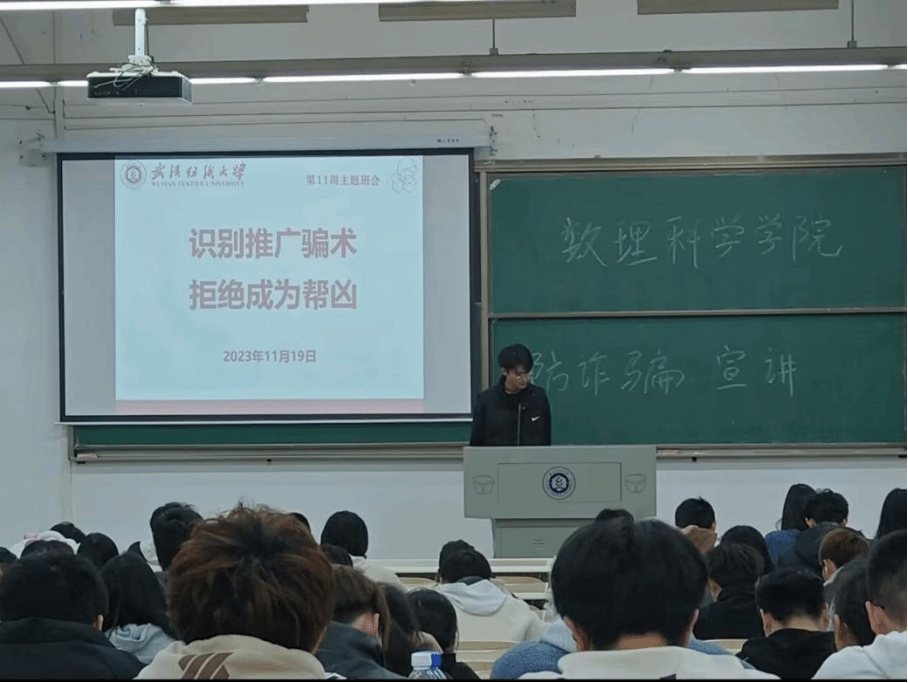 接着,年级长高源围绕“识别推广骗术,拒绝成为帮凶”这一电信防诈主题进行防诈宣讲,希望同学们能够提高警惕,辨别真伪。微电子12301班的高伟豪同学向同学们分享了身边的诈骗故事,提高我们对诈骗的重视。