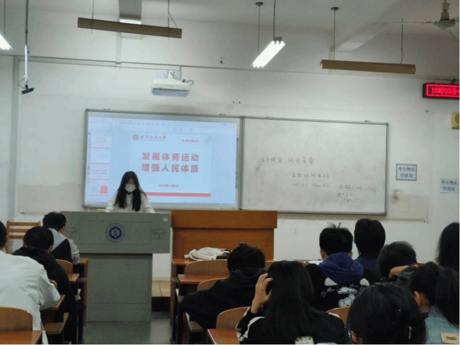 随后,各班班长向大家介绍了“汉马”中的纺大身影,向同学们介绍了今年武汉马拉松里的纺大身影,让同学们看到了纺大的老师、同学们对于体育的热情,对跑步的热爱,以及对英雄武汉的喜爱和自豪。同时还展现出他们自律、坚韧、向上的品格。