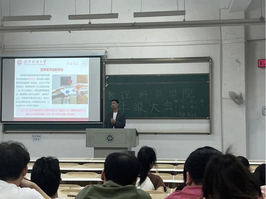会议期间,辅导员熊亚雄又开展了世界读书日主题教育。4月23日是世界读书日,借此机会,熊导希望2022级学子能在课余时间多阅读纸质书本,培养良好的班级学习氛围,带动更多的同学们多读书、多积累,在阅读中更加深刻地认识自己。